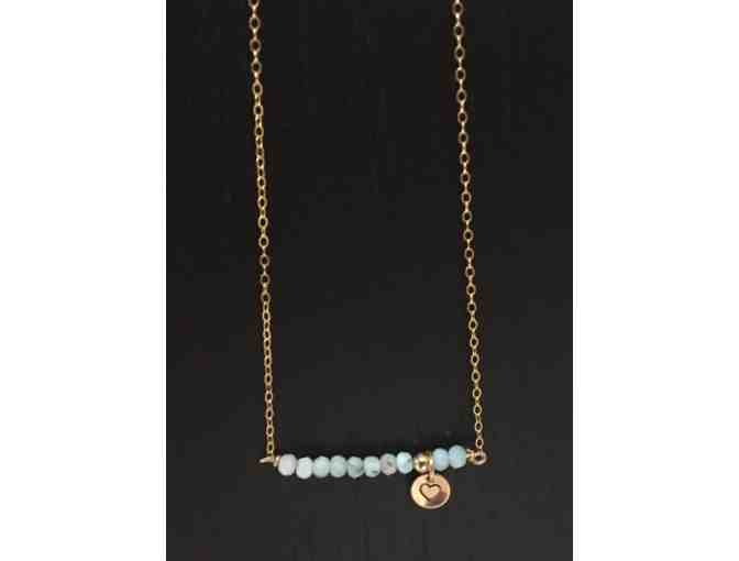 Delicate and beautiful 14k gold fill bar necklace from Mommy Jewelry features blue lace agate stones with a heart disc. Perfect for everyday wear either on its own or layered with other necklaces.