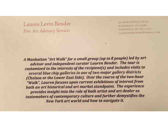 This certificate is good for a Manhattan "Art Walk" for a small group (up to 8 people) led by art advisor and independent curator, Lauren Bender. The tour is customized to the interests of the recipient(s) and includes visits to several blue chip galleries in one of two major gallery districts (Chelsea or Lower East Side). Over the course of the two-hour "Walk", Lauren focuses upon current exhibitions of interest from both an art historical and art market standpoint. The experience provides insight into the role of both artist and art dealer as tastemakers of contemporary culture and further demystifies the New York art world and how to navigate it.