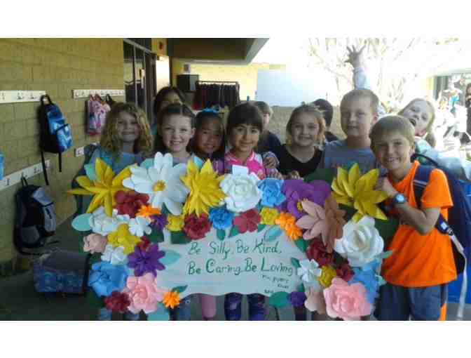 Large craft paper flower mural on heavy posterboard with, "Be Silly, Be Kind, Be Loving, Be Caring"