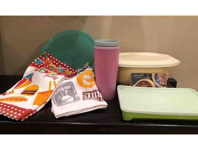 Prepare for your next BBQ with this assortment of Tupperware products. Set includes: OvenWorks 3Qt Roaster w/ Recipe Cards; (2) Collanders; Hot Dog/Sausage Keeper; Hot/Cold Commuter Mug; (2) Kitchen Towels.