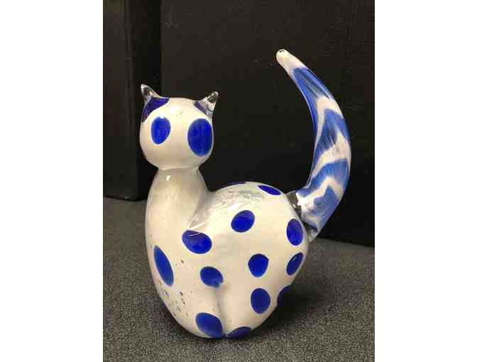 Kool kitty! Art glass ornament in the shape of a cat done in cased glass with cobalt blue and white spots. Heavy enough to be used as a paperweight. There are no labels or manufacturing marks, possibly Murano glass