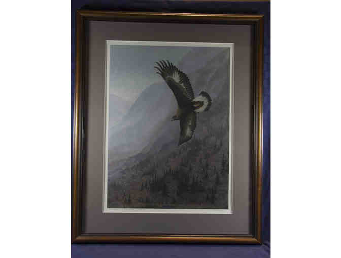 This dramatic scene of a young golden eagle soaring over a mountainside is a one of a limited edition of 300 prints signed and numbered by the famed Canadian wildlife artist, Jean-Luc Grondin. This edition is now sold out.