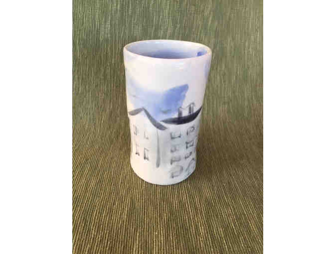 Porcelain vessel, high fired, wheel thrown with brushwork design. Sized 12 cm tall and diameter 7 cm.