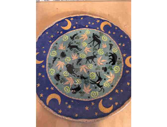 This beautiful serving plate measures 12.5 inches in diameter and features a whimsical design with stars and a variety of woodland animals. Handmade by potter and artist Maura McLaughlin. Maura is a former Playschool mom of three and also ran the Clay Barn at Miss Betty's camp for several years.