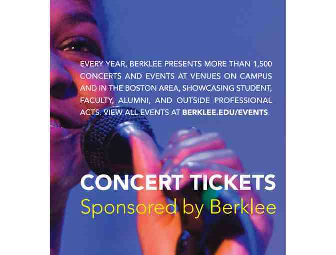 Berklee College of Music: With your 4 tickets you can choose from several of the more than 1,500 concerts and events each year Berklee presents at venues on campus and in the Boston area, showcasing student, faculty, alumni and outside professional acts.