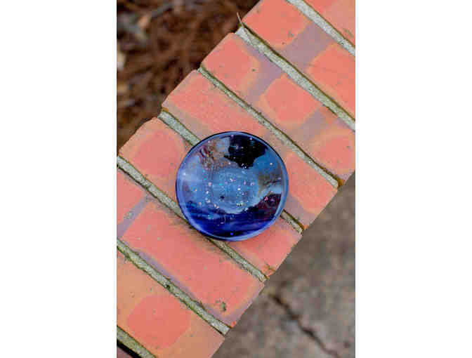 A small bowl in deep blue, with multicolor iridescent flecks of glitter.