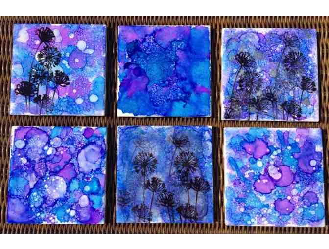 Student designed coasters made with alcohol inks on ceramic tile