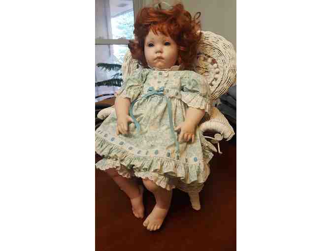 Life like Baby Shay porcelain doll by Donna Rupert. Cloth body, porcelain arms, legs and head. Chair is included.