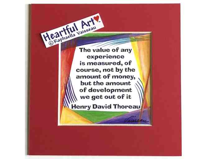 5x5 print of Henry David Thoreau quotation, "The value of any experience is measured, of course, not by the amount of money, but the amount of development we get out of it." Art by Raphaella Vaisseau.