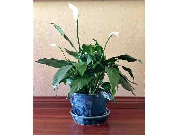 Hand crafted turquoise and blue 7” x 11” glazed pot. Glazed by all the children in Mrs. Chin’s class and planted with a peace lily.
