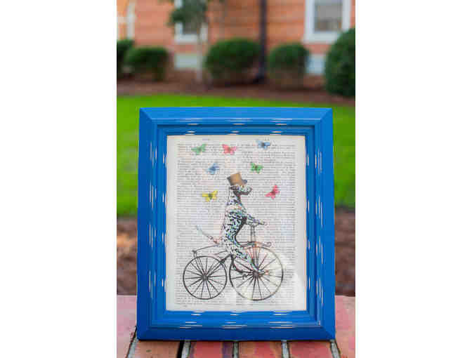 Adorable drawing of a dog riding a bicycle, done on a page from a book and in blue frame.