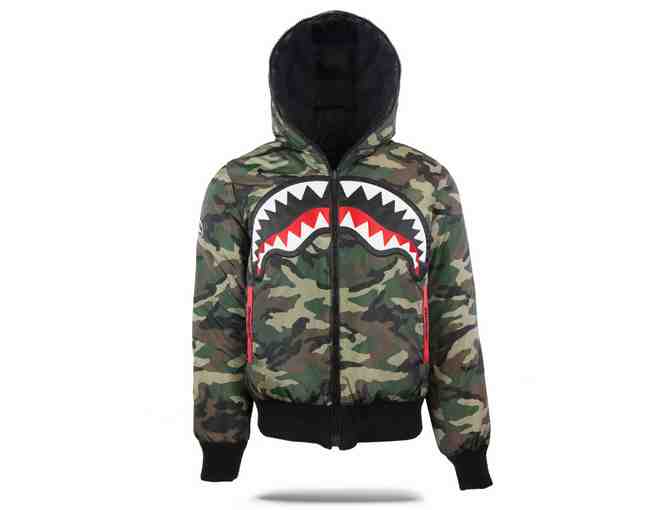 Sprayground Men's Reversible Camo/Black Shark Mouth Down Filled Jacket, Size Men's Medium. New with tags.