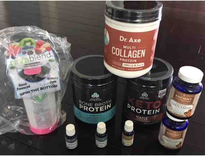 Dr. Axe and Ancient Nutrition has amission to restore health, strength and vitality by providing history's healthiest whole food nutrients to the modern world. Enjoy three protein supplements: Bone Broth Protein in Vanilla (17.4oz), Keto Protein in Maple (18.7oz) and Multi Collagen Protein (454g) plus Ancient Apothecary products: two (2) Fermented Cinnamon 90 capsule bottles and Lemon, Peppermint and Lavender essential oils and a premium food grade non-electric Revablend Bottle withstainless steel blades and BPA free plastic container. New in sealed containers.