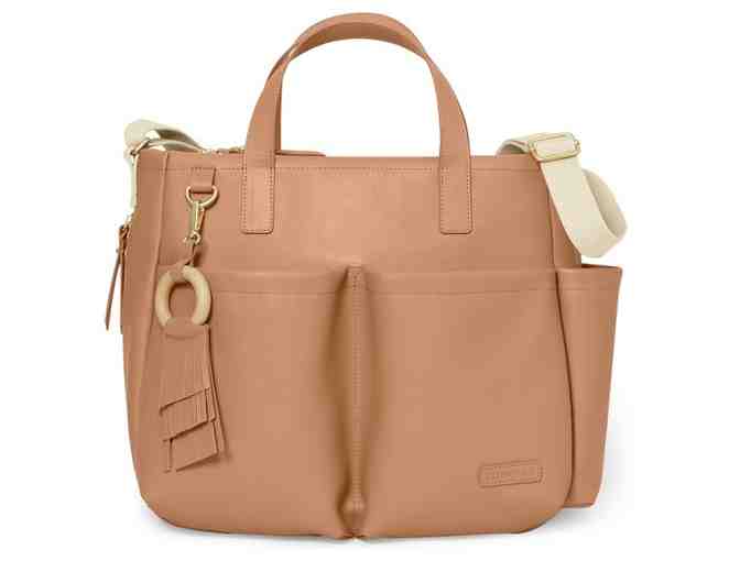 Enjoy laidback luxury with Skip Hop's vegan leather diaper bag. Offering laidback luxury for the effortlessly chic mama, this Greenwich Diaper Bag is made of durable, wipe-clean vegan Caramel leather. The tote features multiple organization pockets and comes with a cushioned changing pad for convenience. Also included is a Como Tomo Silicone BPA-free Teether in Blue and Dapple's Pure 'N' Clean Bottle & Dishes Soap in Lemon Basil.