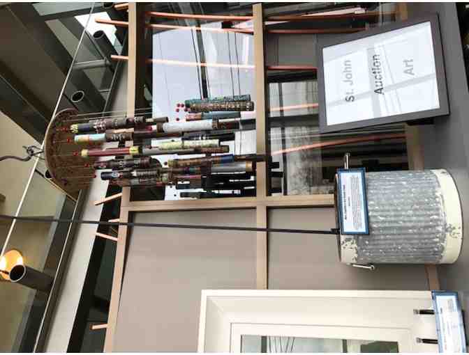 An exciting display of craftmanship and color, this windchime exhibits not only detailed patterns or stories created by each student, but a lovely sound to enjoy for years. Using Navajo and other Native American symbols as inspiration, students created their own intricate pattern to transfer to one-inch bamboo rods. Bringing the piece together is a collectively signed top piece, then varnished to last the test of time. This windchime demonstrates the unique talents of each student coming together as a whole class.