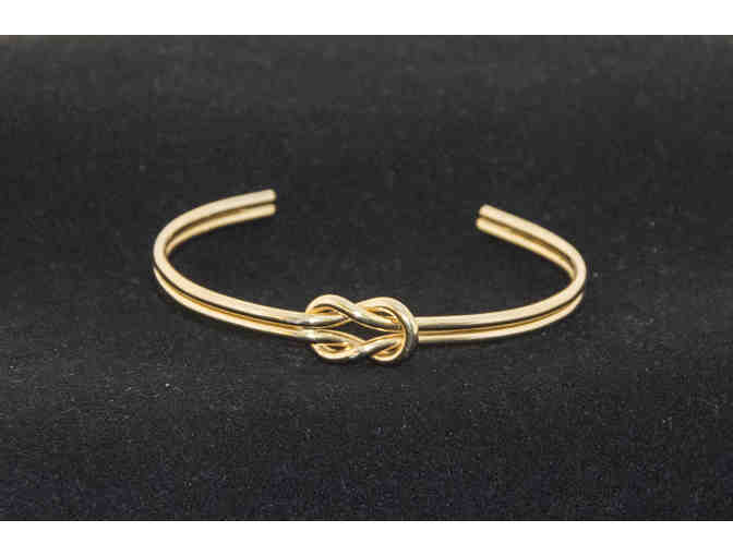 Gold colored cuff bracelet has nice knot feature in the center. It measures approximately 6" from end to end. Best for a slender wrist. In nice used condition.