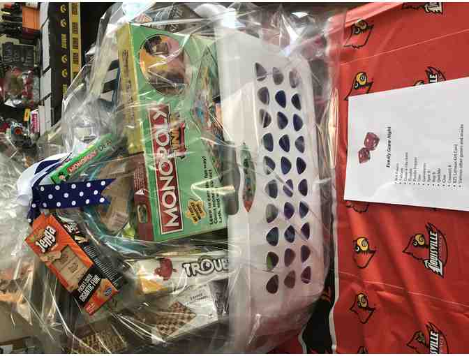 Basket filled with items for great Family Game Night fun!