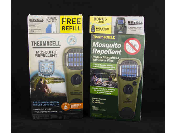 Details: This package includes two ThermaCell repellant appliances, each with a refill, and one with a "no hands" holster.