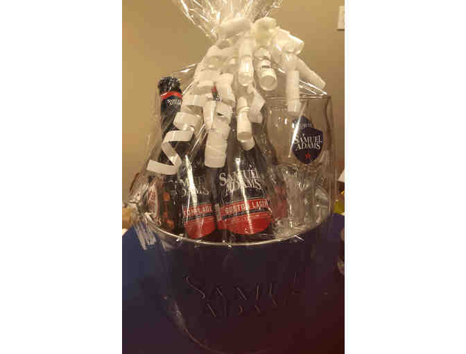 Gift basket includes 6 bottles Sam Adams Boston Lager, 2 Sam Adams beer glasses, and beer nuts.