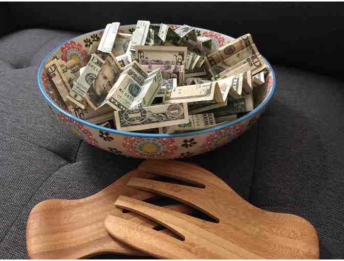 Description: La Jolie Muse ceramic salad bowl with bamboo mixers, $175 cash