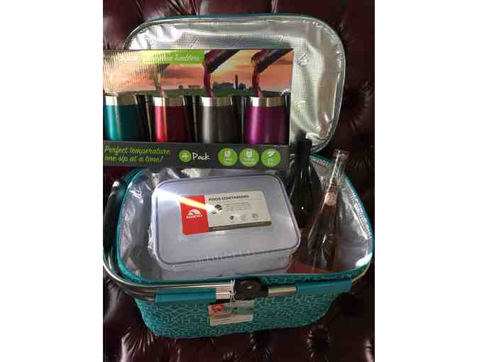 Pack a picnic and enjoy the day outdoors with this insulated cooler bag, food storage system, stylish wine tumblers, and two bottles of wine!