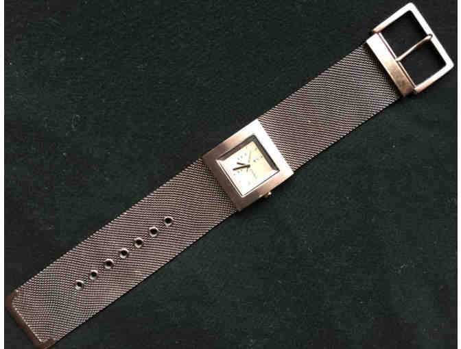 This statement watch has a wide rose-gold color stainless mesh strap. Barely worn.