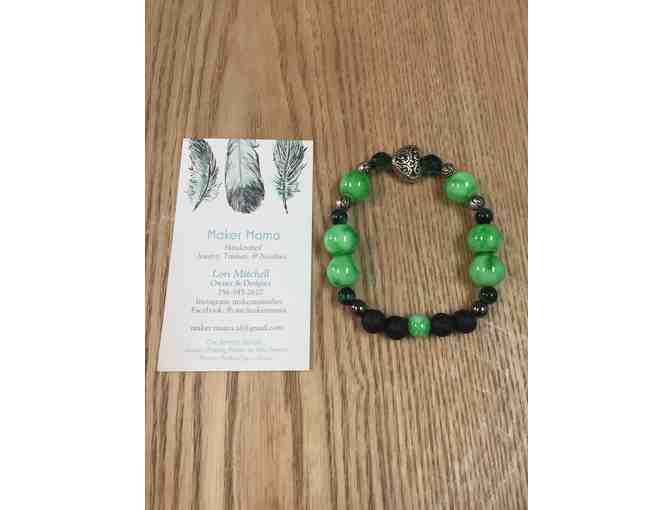 An emerald green aromatherapy diffuser bracelet, hand-beaded with lava stone diffuser beads, handcrafted by Maker Mama.