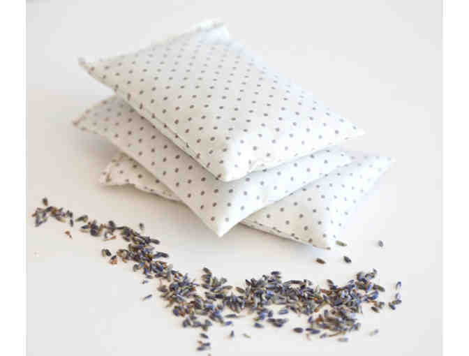 Each sachet is filled with dried organic lavender buds. The sachet bag is made of white cotton fabric with grey dots.
