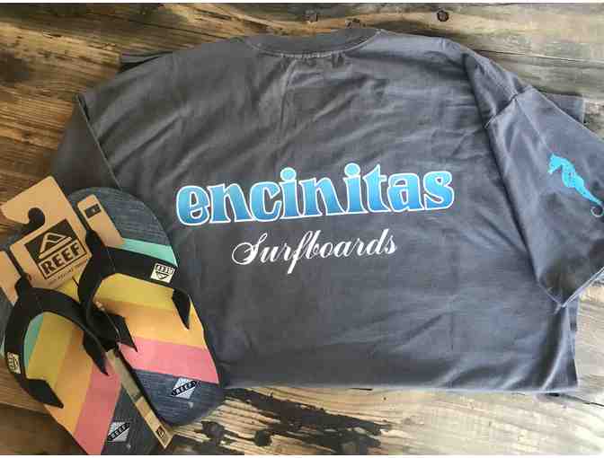 You're ready for summer with this Encinitas Surfboards t-shirt (size L) and Reef flip flops (size mens 9).