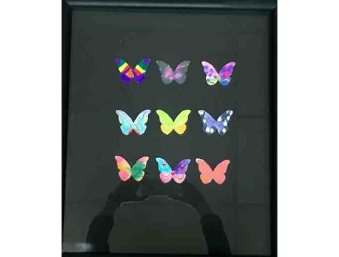 Butterfly collage decorated with various techniques: painting, collage, pastels, crayons, markers, watercolors.