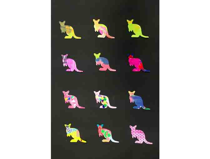 Kangaroo collage decorated with various techniques: painting, collage, pastels, crayons, markers, watercolors.