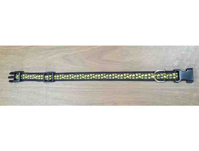 This is a 1" wide black webbing collar featuring a black ribbon with gold stars stitched on top. Matching black snap fastening buckle and closed D-ring.