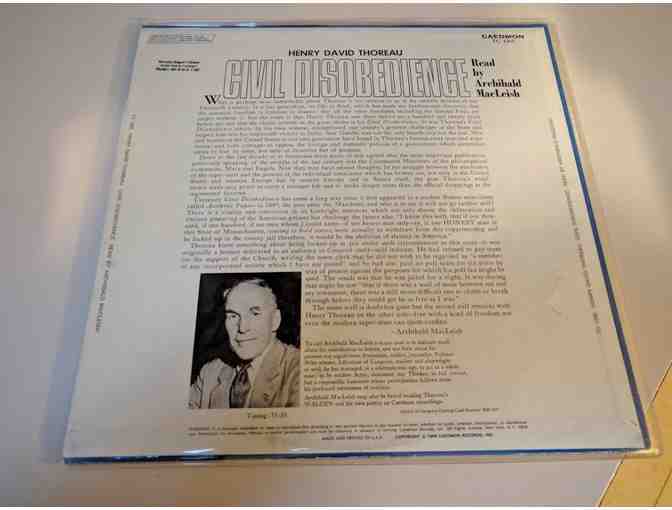 A 33 1/3 rpm vinyl record album of American poet Archibald MacLeish (1892-1982) reading Thoreau's essay, "Civil Disobedience." Released by Caedmon in 1968. An ex-library copy, with label and i.d. marks, held in a plastic sleeve. Record has not been played recently and is presumed to be in good condition. MacLeish's introduction appears on the back of the album cover. An uncommon find.