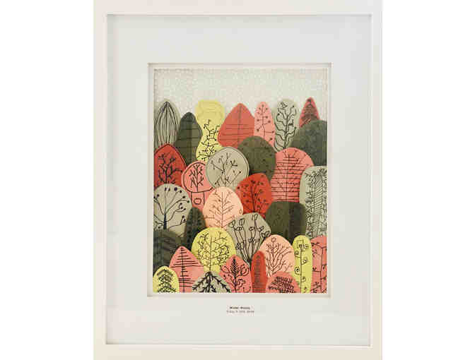 Each child in Sophia's third grade class has depicted a winter tree in ink on paper, presented in collage format in white wood frame and glass front.