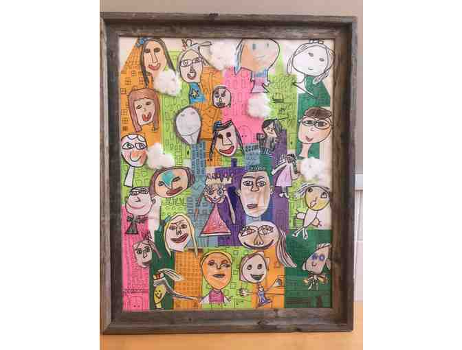 A collaged picture of adorable self-portraits over a drawings of a NYCity-scape from Dan's kindergarten class.