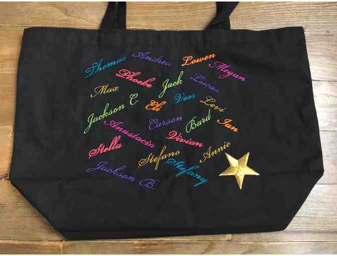 Class tote adorned with stars and embroidered names of all the kids from Candice / Alisa's 5th graders
