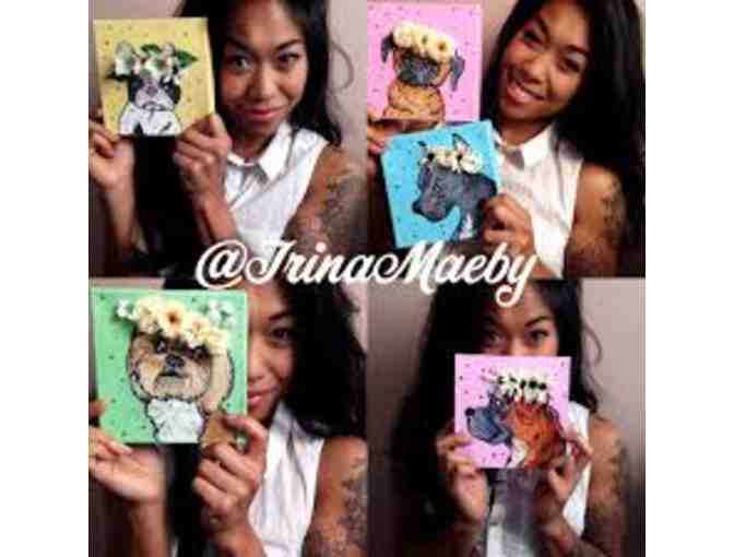 The perfect gift for a friend or for your own fur baby! Each portrait is a custom-made acrylic painting on canvas with a handcrafted flower crown or bow tie. 5-10 good quality head shot photos of your pet must be provided to get started. The more photos, the better!