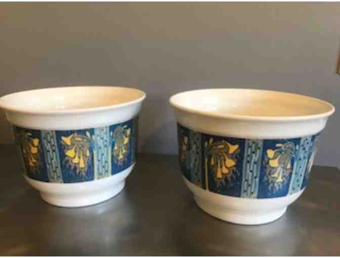 These two decorative flower pots or cache-pots were designed and produced by Philippe d'Arlhac, owner of Milestone Decal Art, an Ossining-based, worldwide ceramic decal design firm.