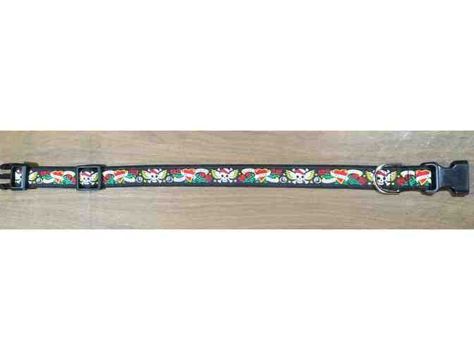This is a 1" wide black webbing collar with a colorful skull & heart tattoo motif ribbon stitched on top. Matching black snap fastening buckle and closed D-ring.
