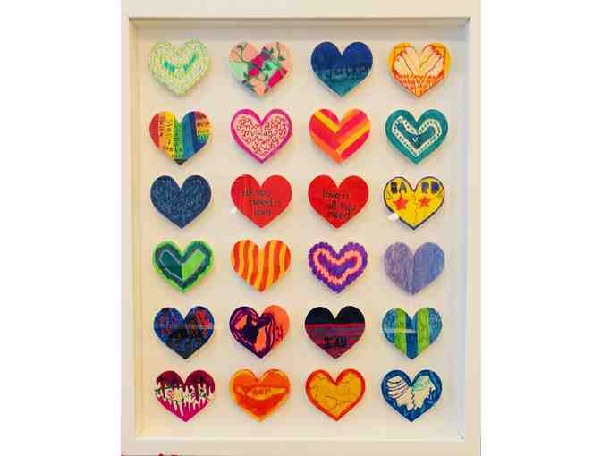 Colorful wood hearts decorated by the kids from 5-437 and mounted in shadowbox frame.