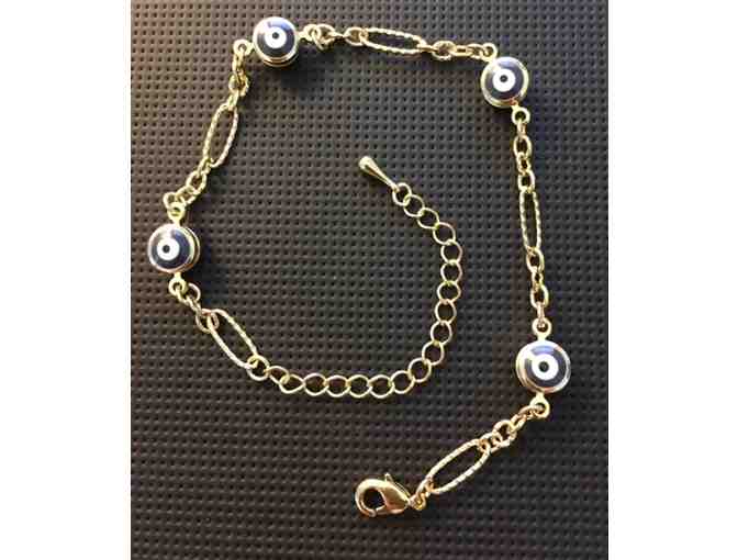 14K Yellow Gold Plated Chain Bracelet featuring four Black Glass Evil Eyes. Adjustable length.