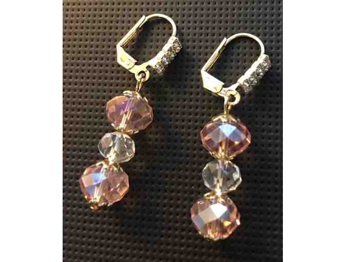 14K Yellow Gold Plated Clear and Pink Glass Bead Drop Earrings with Cubic Zirconia Crystal accents on the earring hook, measuring approximately 1.75" long.