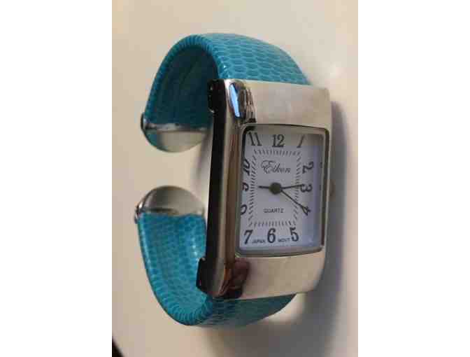 Decorative bracelet-style turquoise watch.
