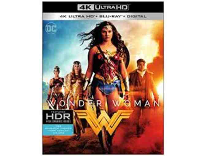 Enjoy a Mega Basket of Wonder Woman goodies including two of each: t-shirts (each adult S), tank tops (each adult L), beach towels, hats, Wonder Woman Pop! Heroes figurines; plus a canvas wall art piece, an insulated lunch sac, a metal water bottle and a lidded plastic cup with straw, temporary tattoos and the Wonder Woman movie 4K Ultra HD DVD.