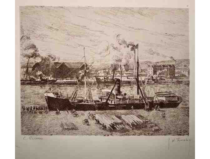 The celebrated Impressionist, Camille Pissarro, enjoyed making etchings and lithographs, some in collaboration with his colleague and expert lithographer, Charles Thornley. This lithograph is a lovely Impressionist scene of the river in Rouen, in Haute-Normandie, where he resided.