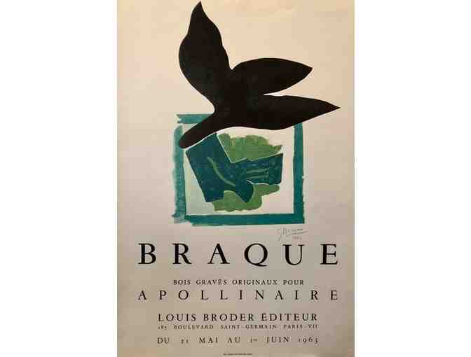 Georges Braque (1882-1963) Oiseau noir sur fond vert. Black Bird on a Green Background. Wood engraving, 1962 (Vallier 181, illustrated p. 279). Signed and dated in pencil. Published by Louis Broder. On a poster advertising the 1963 exhibition, Bois Gravées Originaux Pour Apollinaire, on the premises of the publisher.