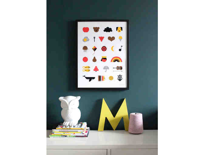 Limited-edition screenprint poster created by TAG parent Erin Jang of Indigo Bunting titled "A to Z Illustrated". Dimensions 18" x 24" and framed.