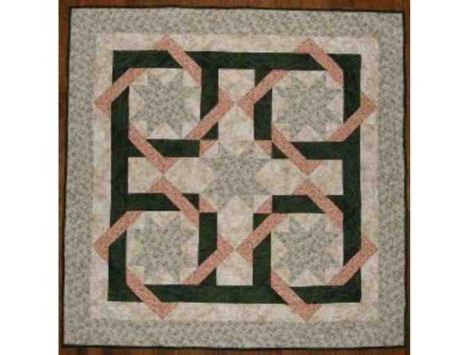 This peach and green quilt may be hung on the wall or used as a table topper. Handmade, machine-pieced and quilted, it measures 38" x 38".  Made with 100% cotton fabric it would be a great wedding, shower, or house-warming gift! A hanging quilt adds color and texture to any home.