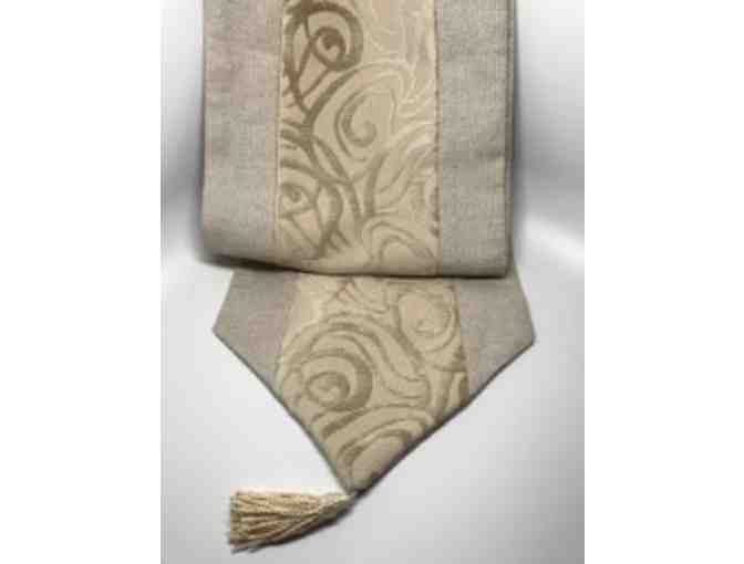 Elegant finely woven European tapestry table runner. Gold colored, 67" with tassels.