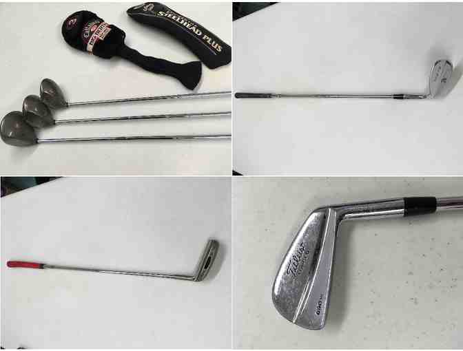 Gently used complete golf club set for men - includes Callaway Big Bertha (driver, 3 wood, 5 wood), Titleist 690MB forged irons (3 through PW), Cleveland PW, and Ping G2 Tess putter. The woods, PW, and putter are in good condition. The Titleist irons are in medium condition. Grips are slightly worn.